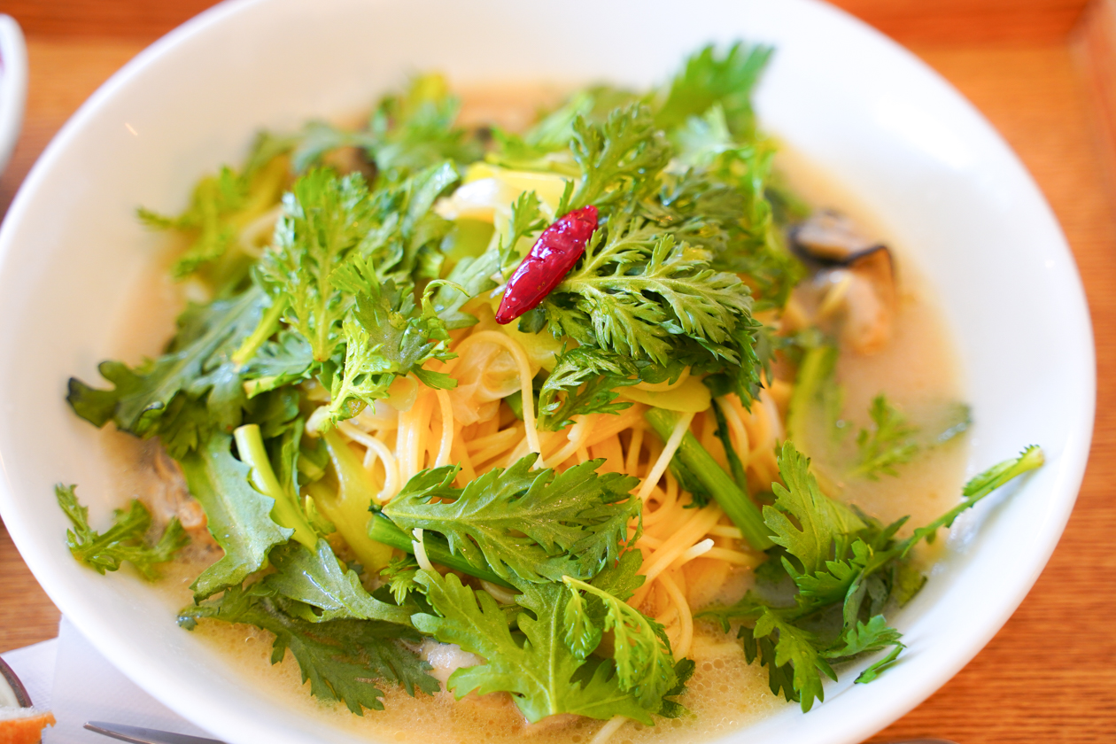 らくだのパスタさんの冬メニューといえば…やっぱりこちら!「牡蠣とネギのオイルソース」を。たっぷりと散らされた春菊の下にも牡蠣がごろっと入っています。あっさりめのオイルソースがかえって食欲をそそります。キャロットラペや小鉢、パンも付いて大満足!