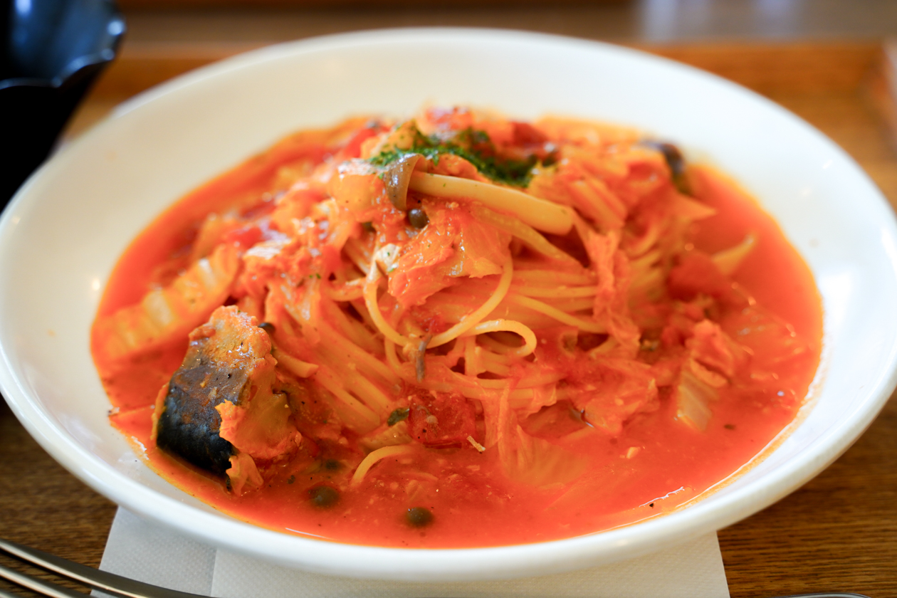 「鯖と白菜のトマトソース」は、白菜やトマトの旨みが溶け出しているのか、かなり甘みが感じられて、鯖とも好相性!美味しいスープパスタのような感覚で、するすると胃におさまっていきます。