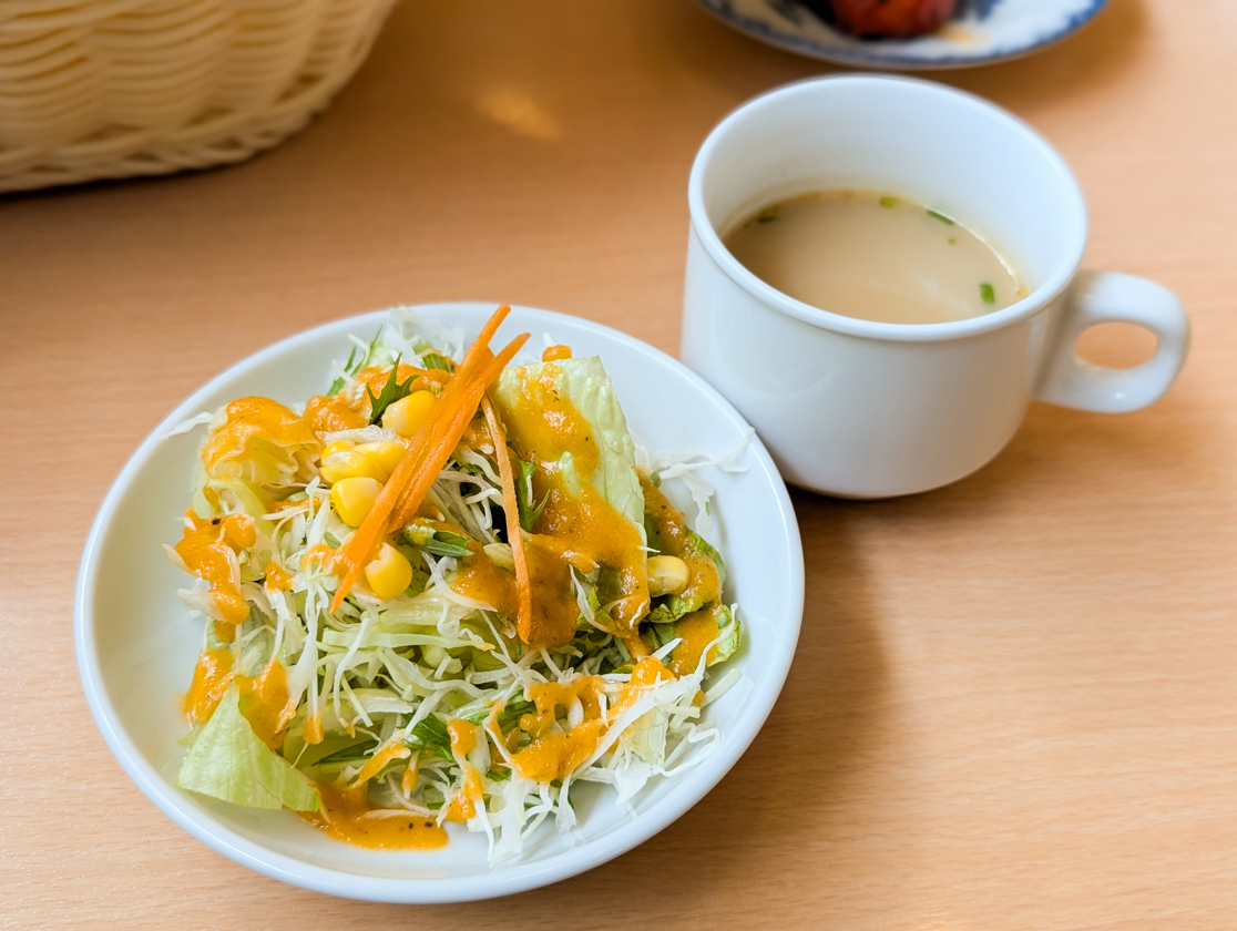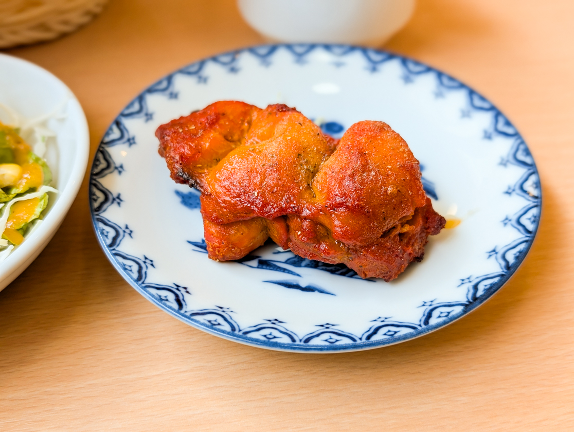 こちらはカレーにナン、サラダ、タンドリーチキン、ドリンクがセットになった「Dセット」1,050円。野菜カレーはじゃがいもをはじめ、いろんな野菜がゴロゴロ入っています。スパイシーなタンドリーチキンも美味しい!