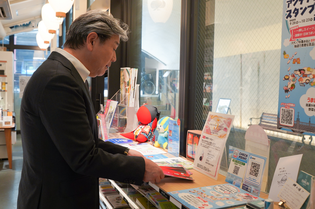 無事に協定式を終えた後は、田中市長に岐阜トーキョーの店内をご案内!飛騨高山の銘菓である豆板やとちのみせんべい、飛騨山椒、高山市の酒蔵でつくられた地酒、飛騨牛カレーといった高山市産の人気商品や、設置してある観光案内パンフレットなどを手に取ってご覧いただきました。