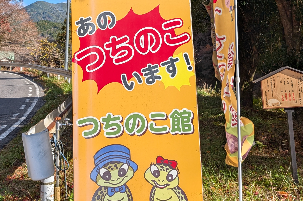 看板には、「あの“つちのこ”います!」というフレーズとともに、帽子を被ったつちのこと、赤いリボンを頭につけたつちのこのイラストが。