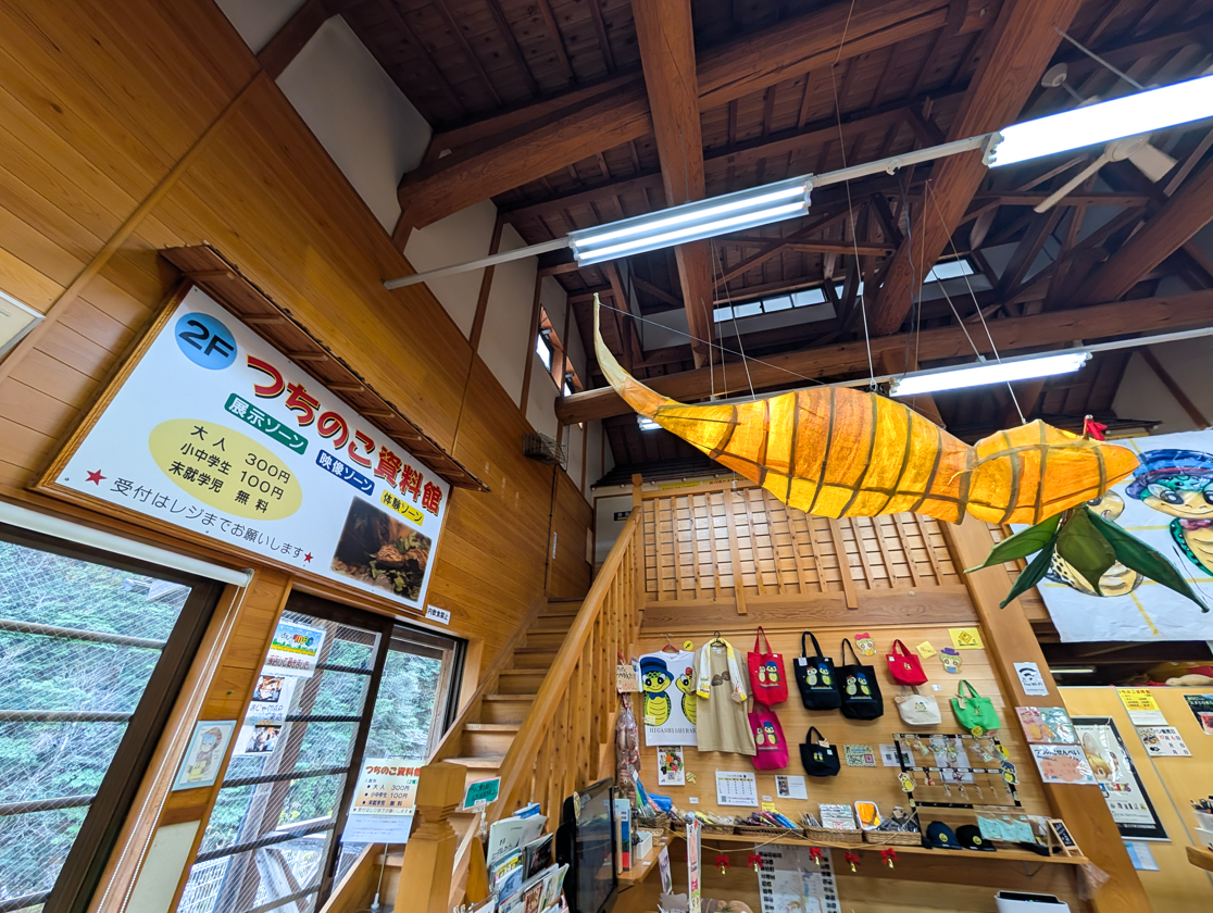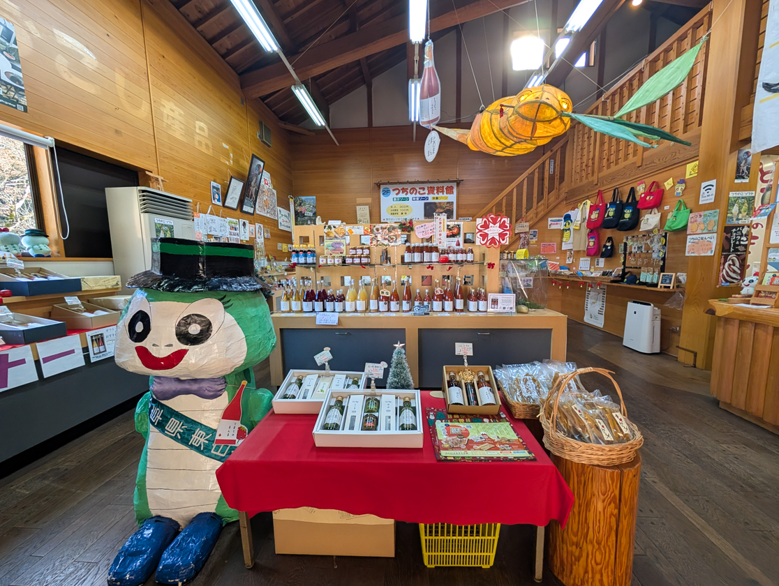 中に入ると、マスコットキャラクターの「つっちー」や、リアルなつちのこの張り子が迎えてくれます!東白川村の特産品で作られたトマトジュースをはじめとするお土産がずらり。