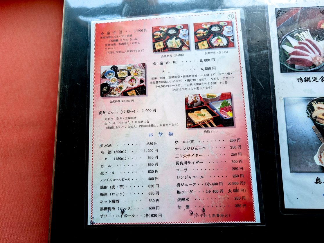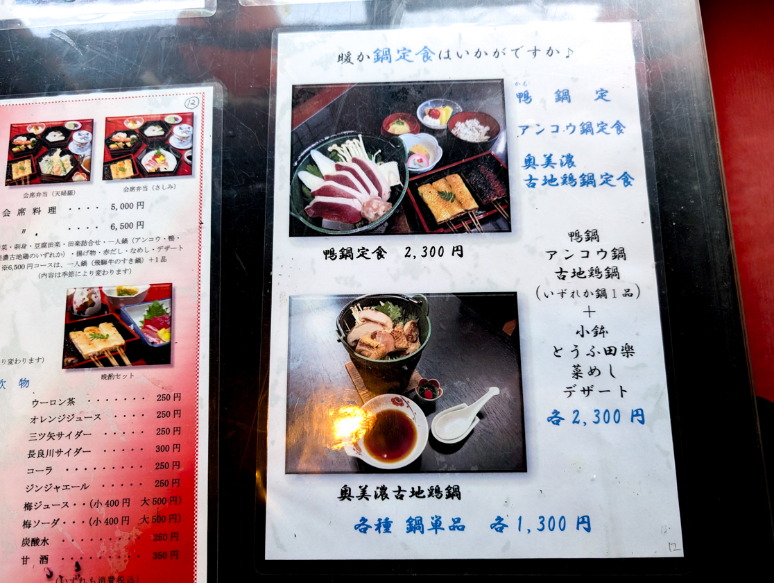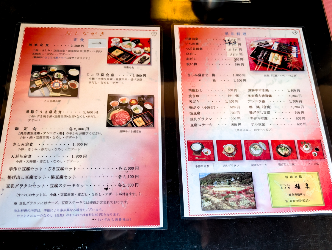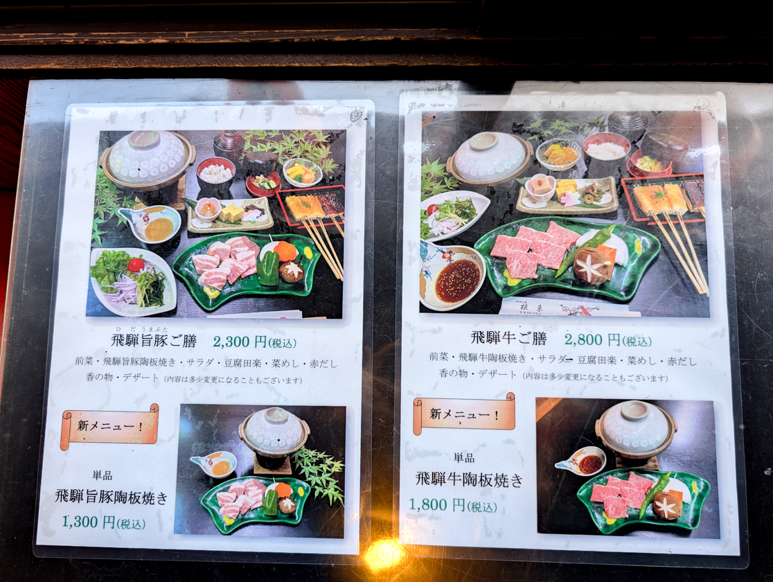 料理は名物の田楽3種と小鉢や刺身、なめしなどがつく「田楽定食」をはじめ、鍋や天ぷらなどの定食、手作り豆腐などのセット、単品料理まで豊富。豪華な「飛騨旨豚ご膳」や「飛騨牛ご膳」もあります。
