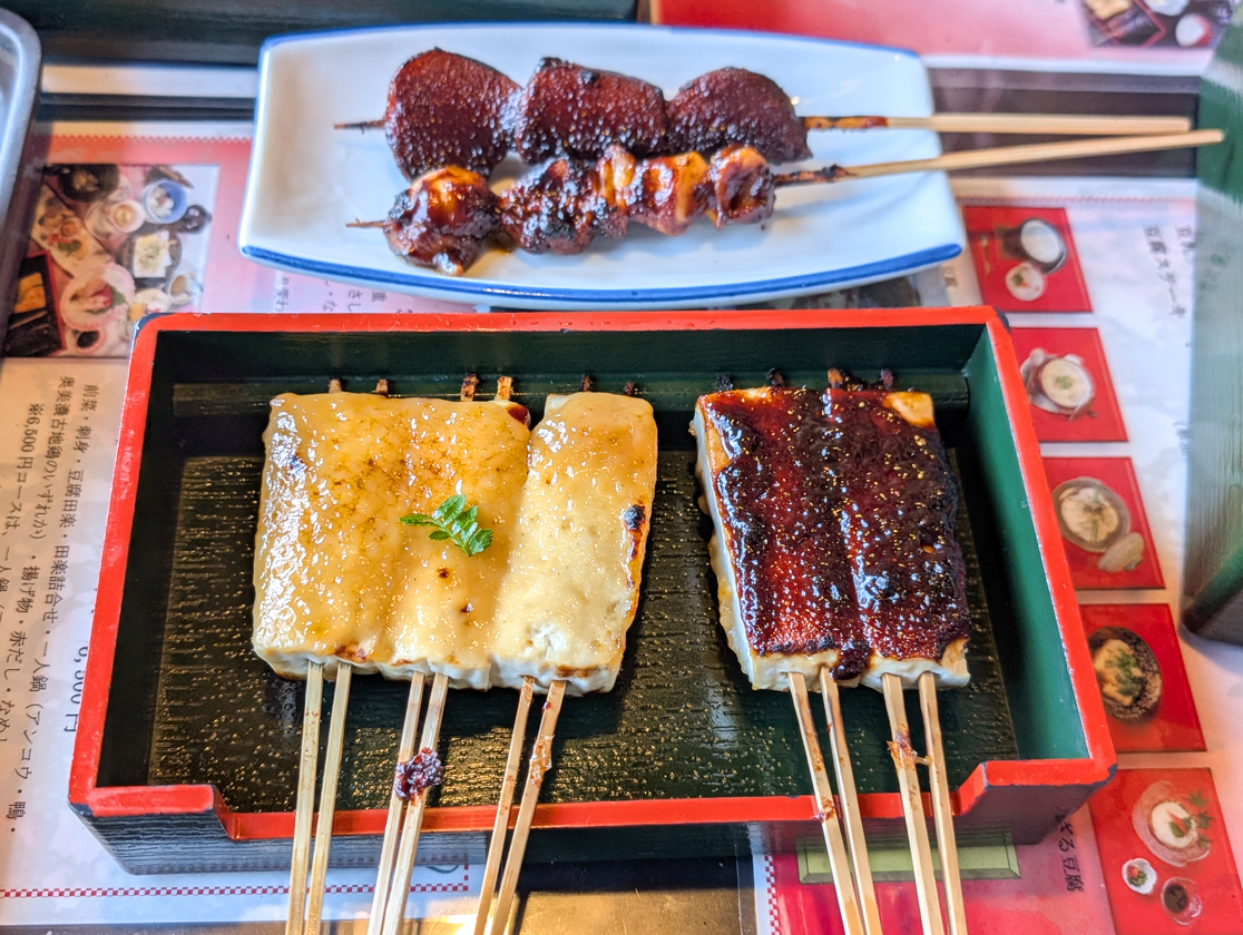 そして、こちらが定食のメインの田楽!梅の紅白に合わせて豆腐の両面にそれぞれ白味噌と赤味噌を塗って焼いた「豆腐田楽」は、このお店の看板メニューとして、地元で長く愛され続けています。里芋はほっこり、つぶ貝はやわらかく、どちらも味噌とよく合って、なめしご飯が進みます。