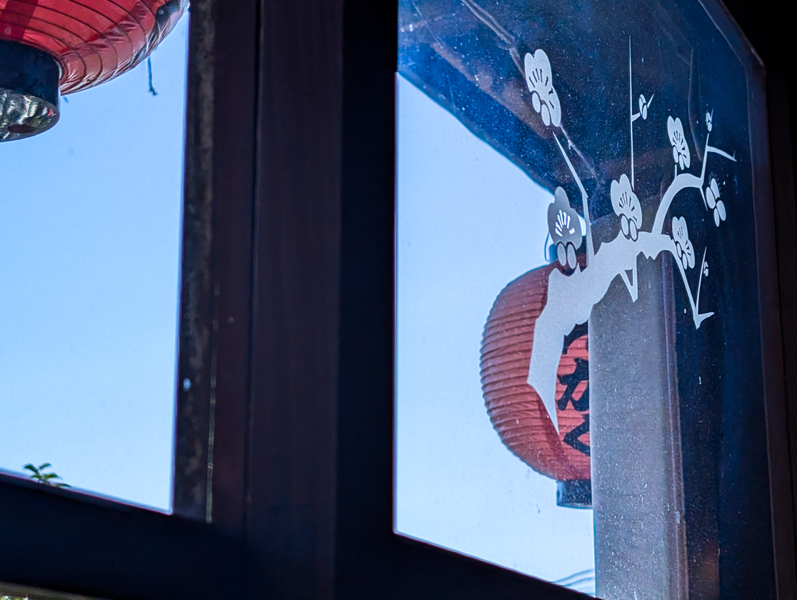 2階は広々とした座敷席と、仕切りのある窓際のテーブル席があります。赤い絨毯が敷かれた廊下や意匠を凝らした建具、梅があしらわれたガラス窓など、風情が感じられます。