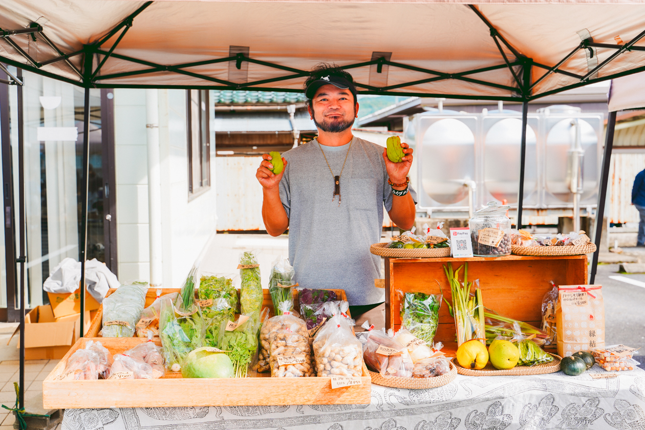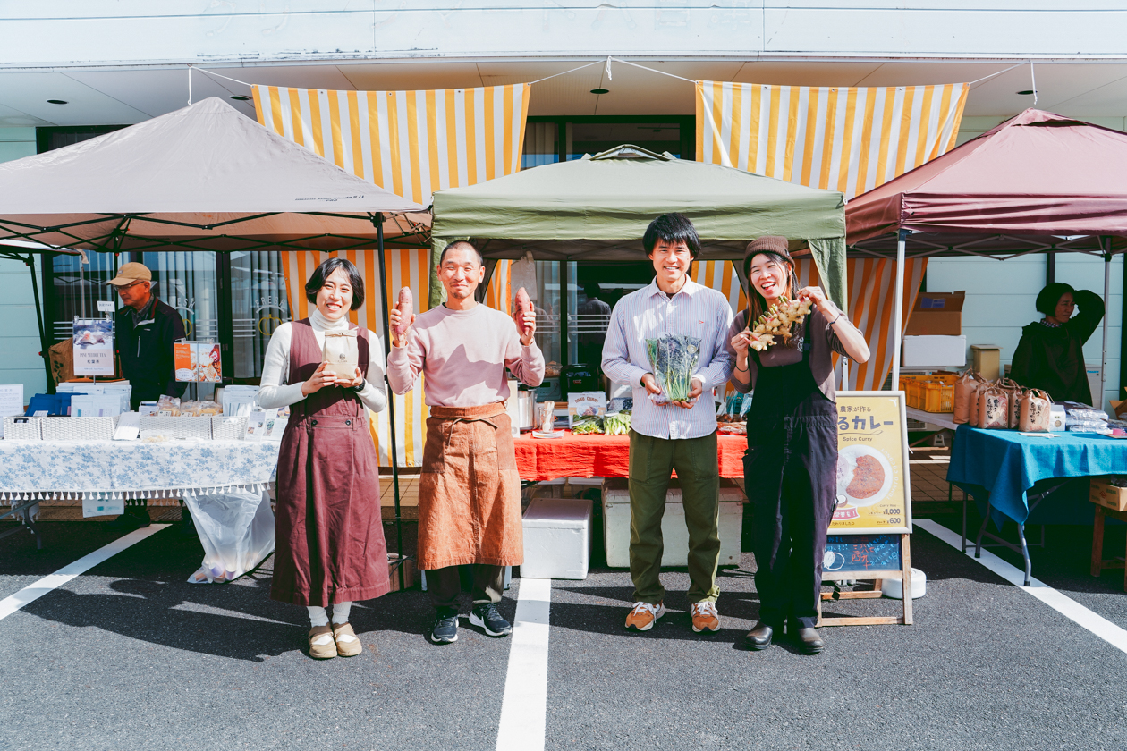 約2年前からスタートした「やおつオーガニックマルシェ」。当初は “ 八百津町で有機農業を広げたい ” という想いのもと、なる農園の渡邊さん夫妻(右)とオータニ農業の大谷さん夫妻(左)が協力し、そこにこぐさの丘さんが加わった3店舗から始まったったとのこと。やがて、その想いに賛同してくださるお店が徐々に集まり、1年経たないうちに約20店舗ほどの規模になったそうです。