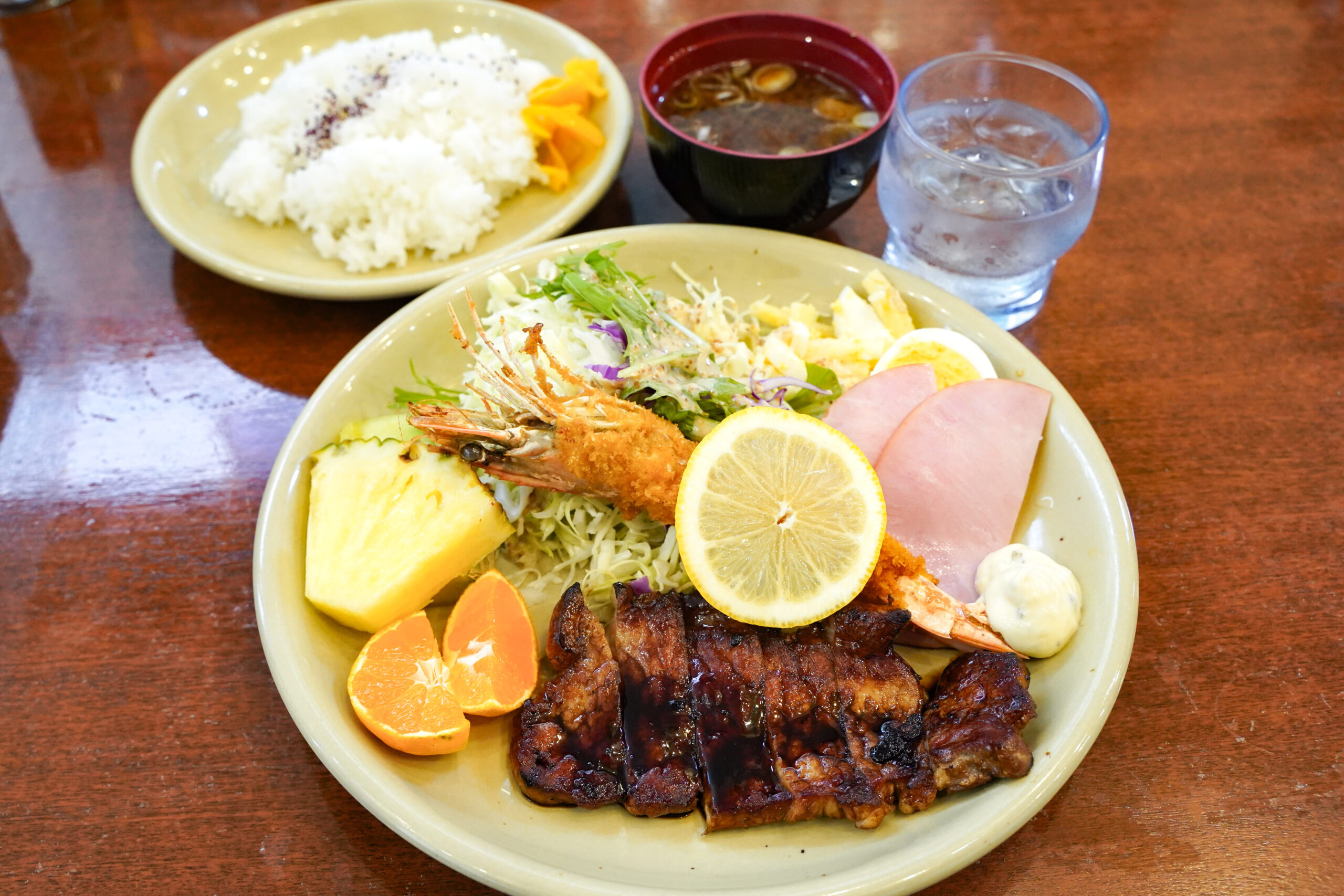 こちらはポークソテーとエビフライがついたBランチ。特製ソースでこんがり焼かれたポークソテーはちょっと和風な味付けで、白ごはんが進みます!こちらのフルーツもメロン、パイナップル、オレンジと3種類ついていて、ちょっぴり贅沢な気分になりました。