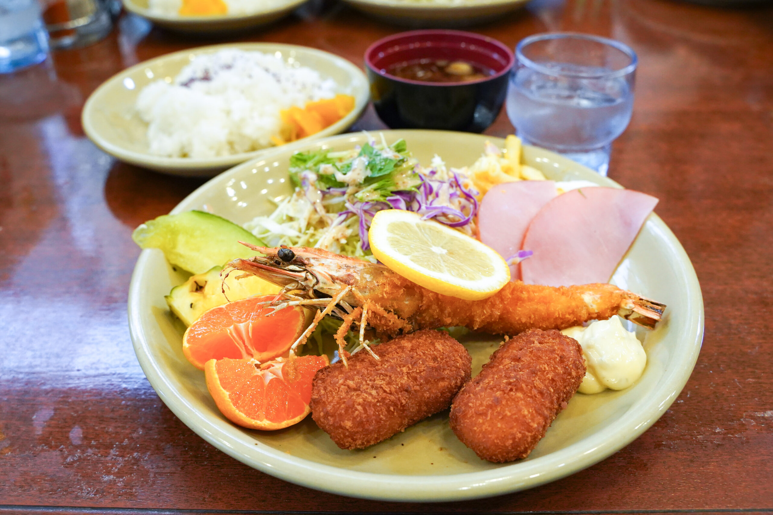 Aランチはカニクリームコロッケにエビフライ、サラダ、マカロニ、ゆで卵、フルーツがワンプレートにのっていて、まるで大人のお子様ランチのよう!もちろん、ライスとお味噌汁もセットです。カニクリームコロッケは、薄い衣でさくっと揚がっていて、中はとろりとクリーミー。有頭エビフライもぷりっとしていて、タルタルソースをたっぷりつけていただきました!