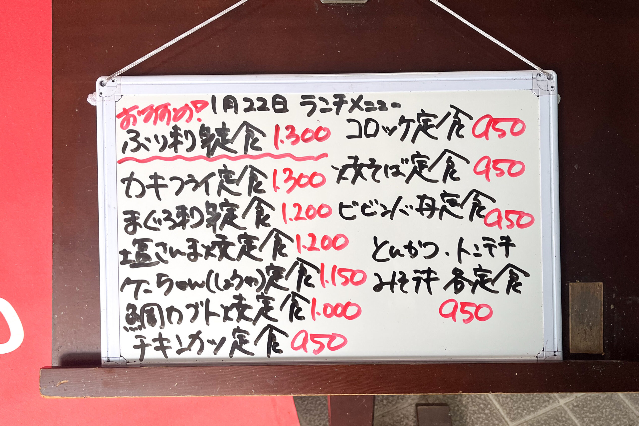 この日のランチメニューには、ぶり刺身やカキフライ、まぐろ刺身といった海鮮の定食に、郷土料理のケーちゃん(鶏ちゃん)、チキンカツ、焼きそば、ビビンバなど、定番からちょっと珍しい定食までが揃います。ちなみにうなぎやイサキの塩焼き、鯛頭などがいただける時もあるそうで、その時々の海鮮メニューが特に人気のよう!